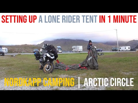 Here I'm setting up my Lone Rider tent after a long journey riding to get to this place, Nordkapp camping, in the Arctic circle, at around half an hour driving from Nordkapp, Norway.